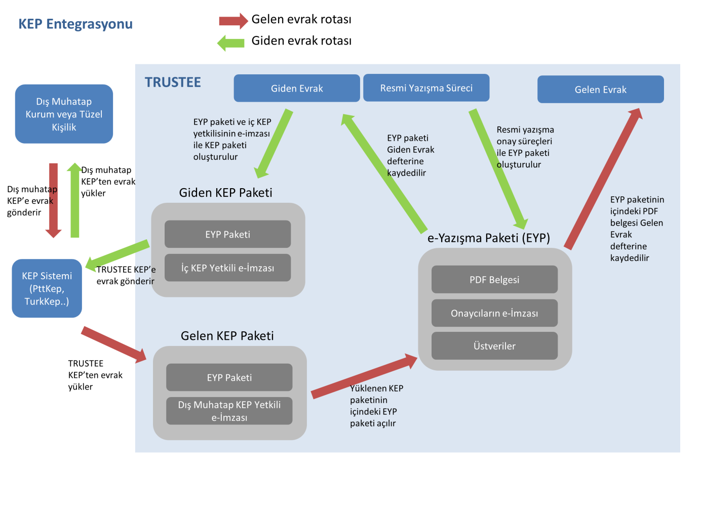 KEP entegrasyonu için Ptt KEP, Türk KEP veya Tnb KEP vb. seçenekler kullanılabilir. Başka kurumların gönderdiği KEP e-Yazışma paketleri otomatik olarak açılıp sisteme gelen evrak olarak eklenir ve iç birimlere havalesi sağlanır.